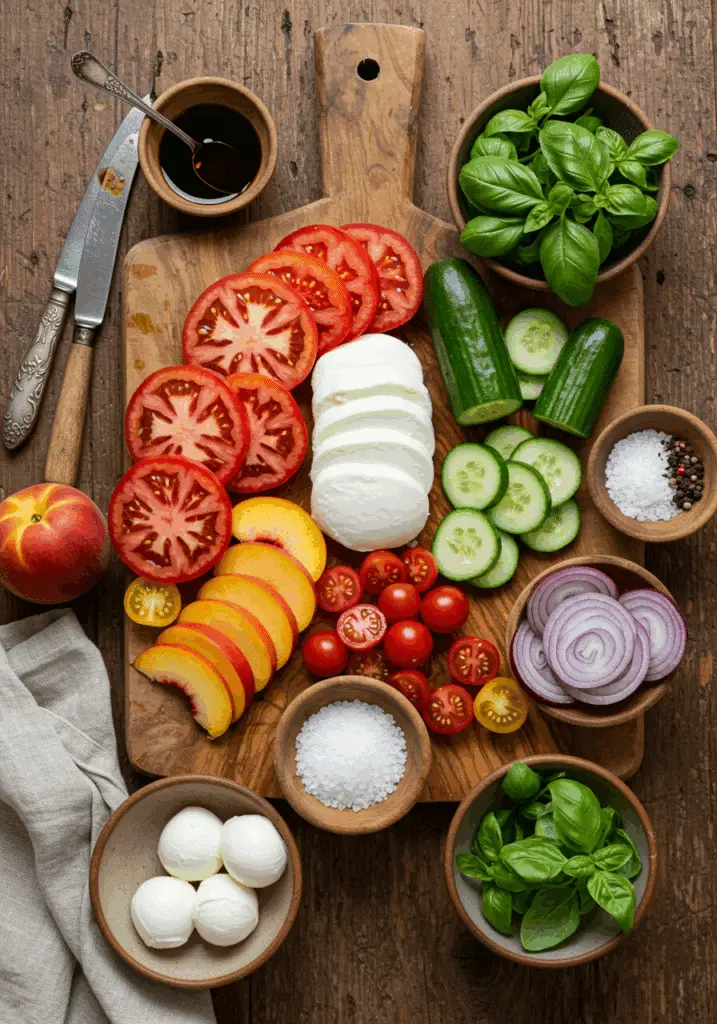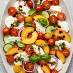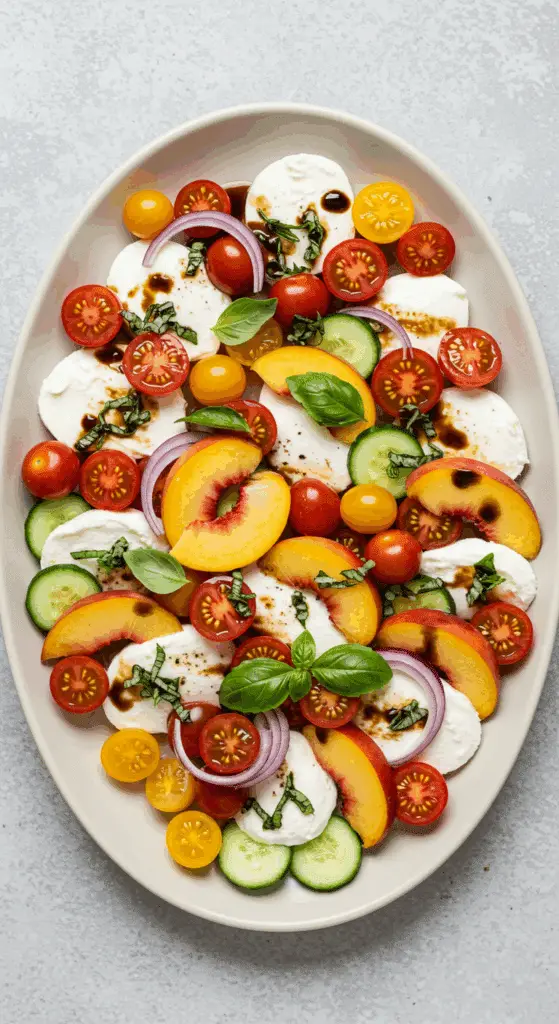 Craving a vibrant, no-cook dish that captures the essence of summer? This Summer Caprese Salad is your perfect choice! Featuring juicy heirloom tomatoes, creamy fresh mozzarella, sweet peaches, crisp cucumbers, and a touch of tangy red onion, all garnished with fragrant basil and a drizzle of balsamic glaze, this salad is a delightful twist on the classic Caprese