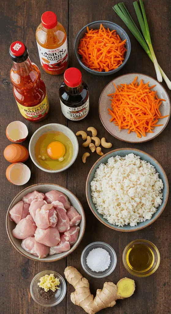 - Gather all ingredients: 2 tablespoons vegetable oil, 1 egg, 2 chicken thighs, kosher salt, 1 cup shredded carrots, 1 tablespoon sweet chili sauce, 1 teaspoon ginger, 1 teaspoon soy sauce, 3 cups cold rice, 1-1 ½ teaspoons chili oil, 2 tablespoons cashews.