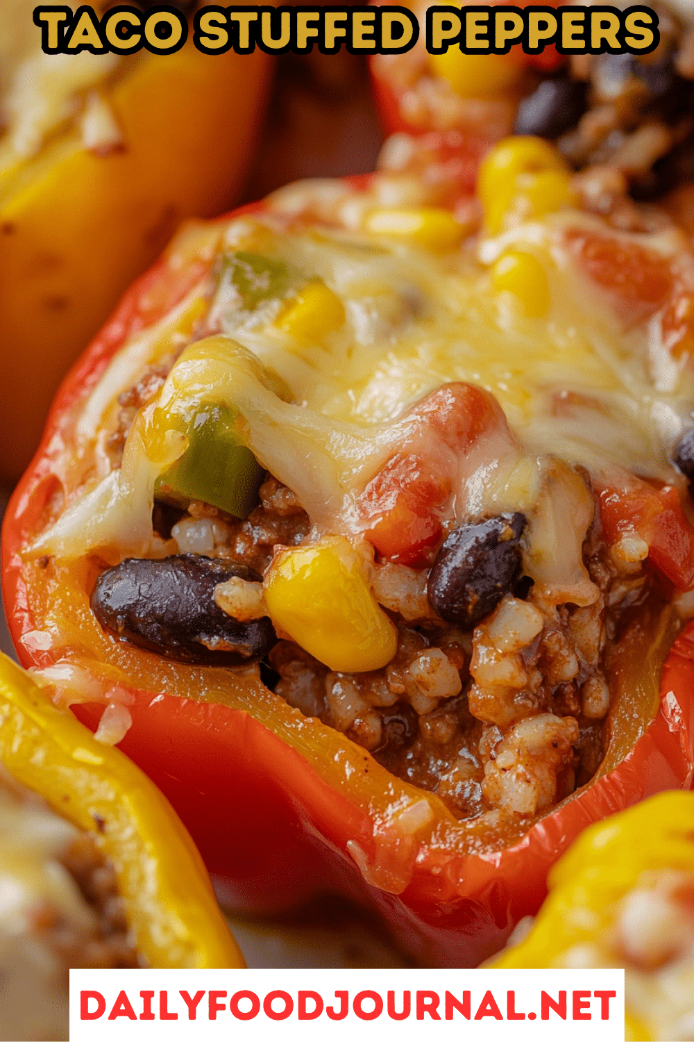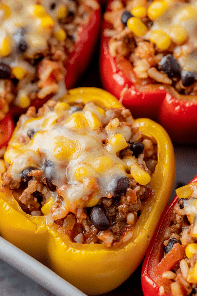 Learn how to make easy and delicious Taco Stuffed Peppers filled with seasoned meat, beans, corn, and rice. A healthy, hearty recipe perfect for busy weeknights or meal prepping!