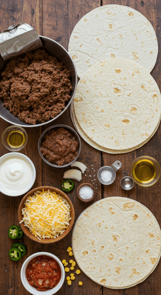 Why These Ingredients Matter: The ground beef and beans provide protein and heartiness, while the taco seasoning and salsa deliver bold, spicy flavor. The cheese adds gooey richness, and the tortillas create a satisfying wrap, making this a balanced, crowd-pleasing meal perfect for Tex-Mex lovers.