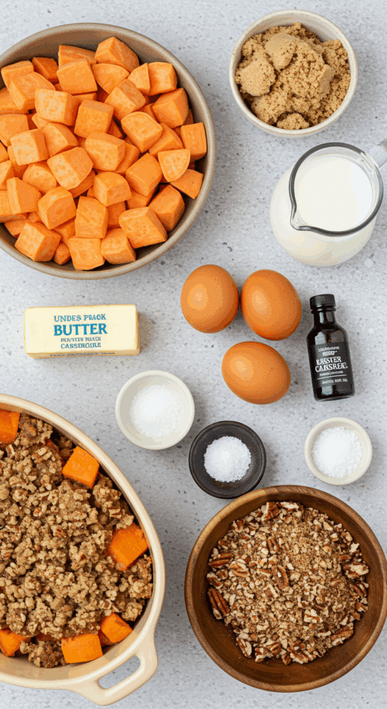 The Best Sweet Potato Casserole uses simple ingredients to create a creamy, sweet, and crunchy dish. Here’s what you’ll need for 6-8 servings: