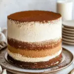 Summary: This recipe reimagines Tiramisu as a four-layer cake using separately flavored vanilla, coffee, and chocolate cake layers soaked in coffee syrup. It features a rich mascarpone frosting, also divided and flavored with vanilla, coffee, and dark chocolate, potentially applied in an ombre style, and finished with a classic cocoa powder dusting.
