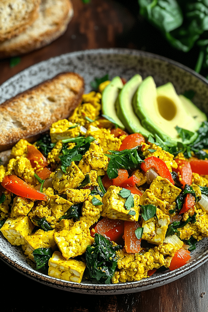 I envisioned a scramble made with crumbled tofu, seasoned with warming spices like turmeric and cumin, and packed with colorful vegetables like onions, bell peppers, and spinach. It’s a dish that’s both comforting and energizing.