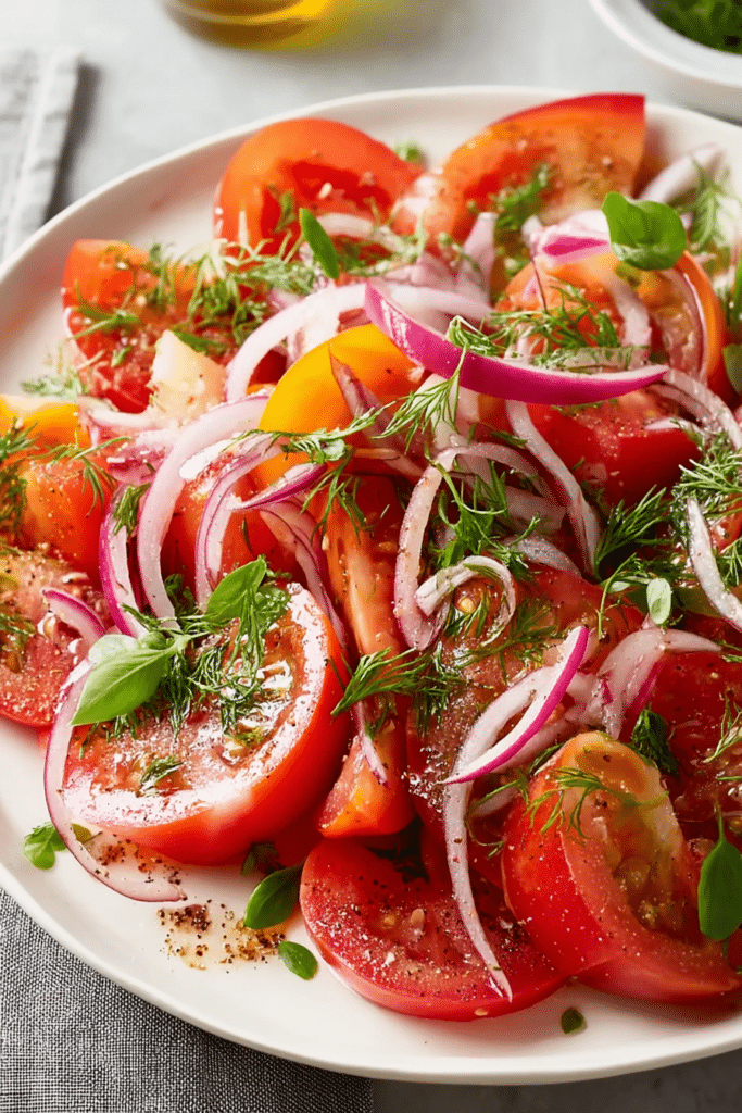 Make this fresh Tomato Salad with juicy heirloom tomatoes, herbs, and a tangy vinaigrette. A simple, vibrant dish perfect for summer meals, barbecues, and light dinners.