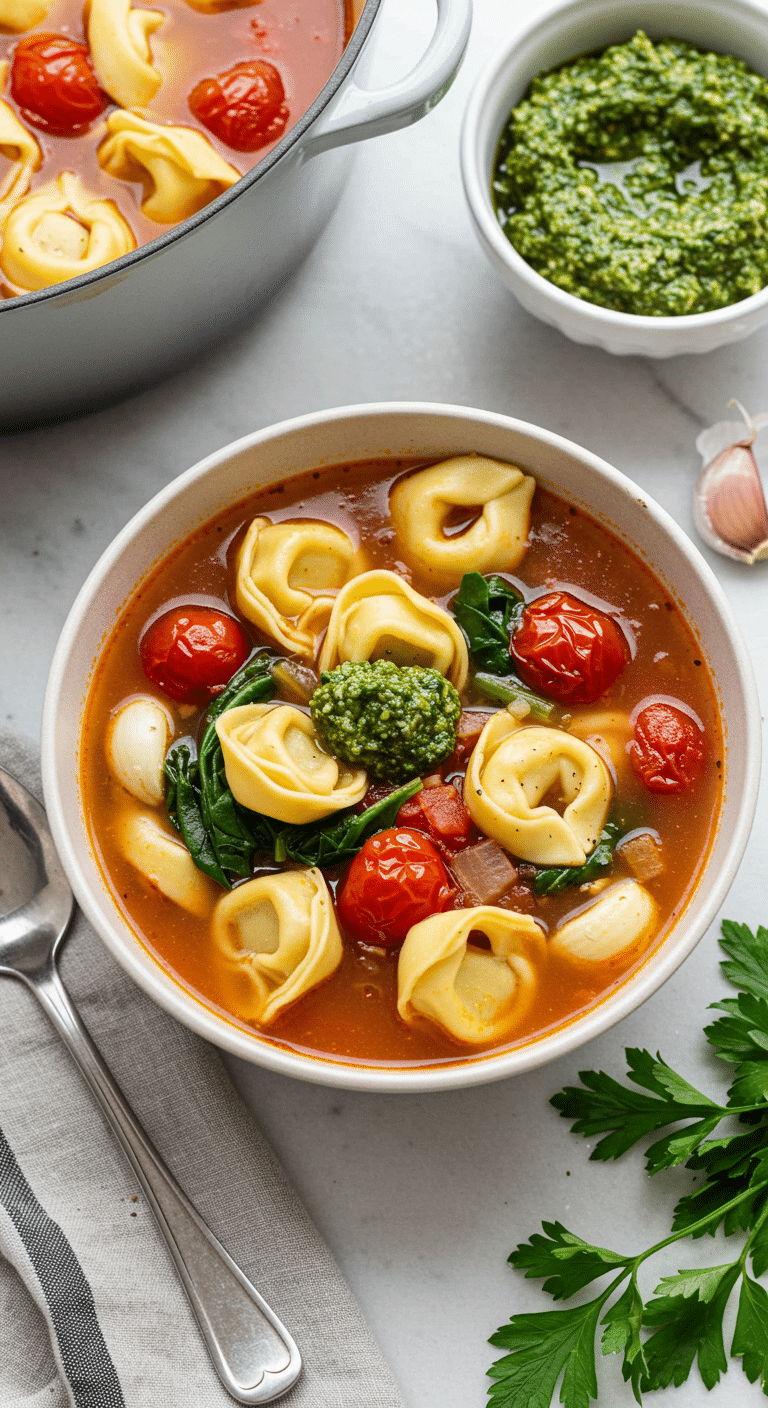 The Tortellini Soup is a quick, comforting meal that brings vibrant, Italian-inspired flavors to your table in just 50 minutes. With cheesy tortellini, hearty vegetables, and a zesty kale pesto topping, it’s perfect for weeknight dinners, cozy evenings, or vegetarian meals. Try it as is or add your own spin—maybe some extra veggies or spice? Share your creations with us! Grab your pot, gather your ingredients, and enjoy every warm, delicious spoonful!