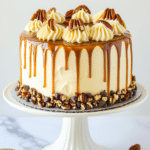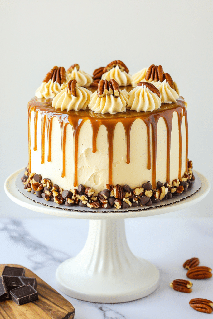 Summary: This recipe creates a decadent layer cake inspired by Turtle candies. It features moist chocolate cake layers, filled with homemade salted caramel sauce, toasted pecans, and a caramel-infused buttercream dam. The cake is frosted with caramel buttercream, topped with a chocolate ganache drip, and garnished with more caramel and pecans.