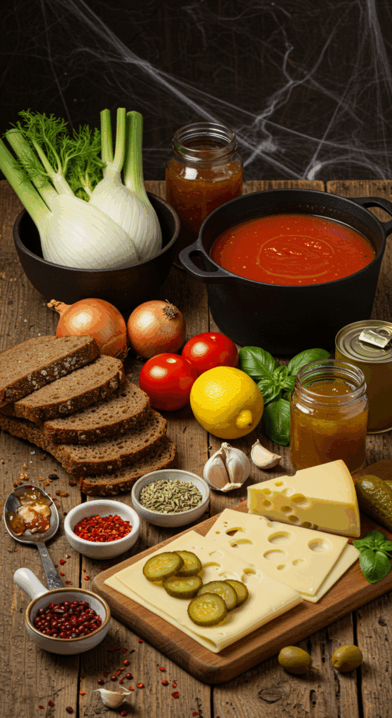 Tomatoes and fennel provide vitamins A and C, making the soup nutritious. The olive oil adds healthy fats, and the cheese in the sammies offers protein and calcium. The dark bread and spooky garnishes create a vampire-themed look, perfect for Halloween. The ingredients are widely available and adaptable for vegetarian, vegan, or gluten-free diets, making this recipe versatile for party planning.