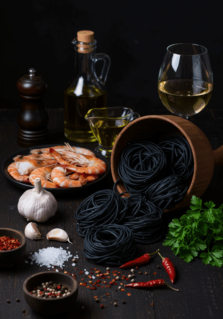 • 12 oz squid ink pasta: The star, delivering a jet-black color and subtle briny flavor. High in carbs for energy (~45g per serving). Substitutions: Regular spaghetti or black bean pasta for gluten-free; color won’t be as striking.