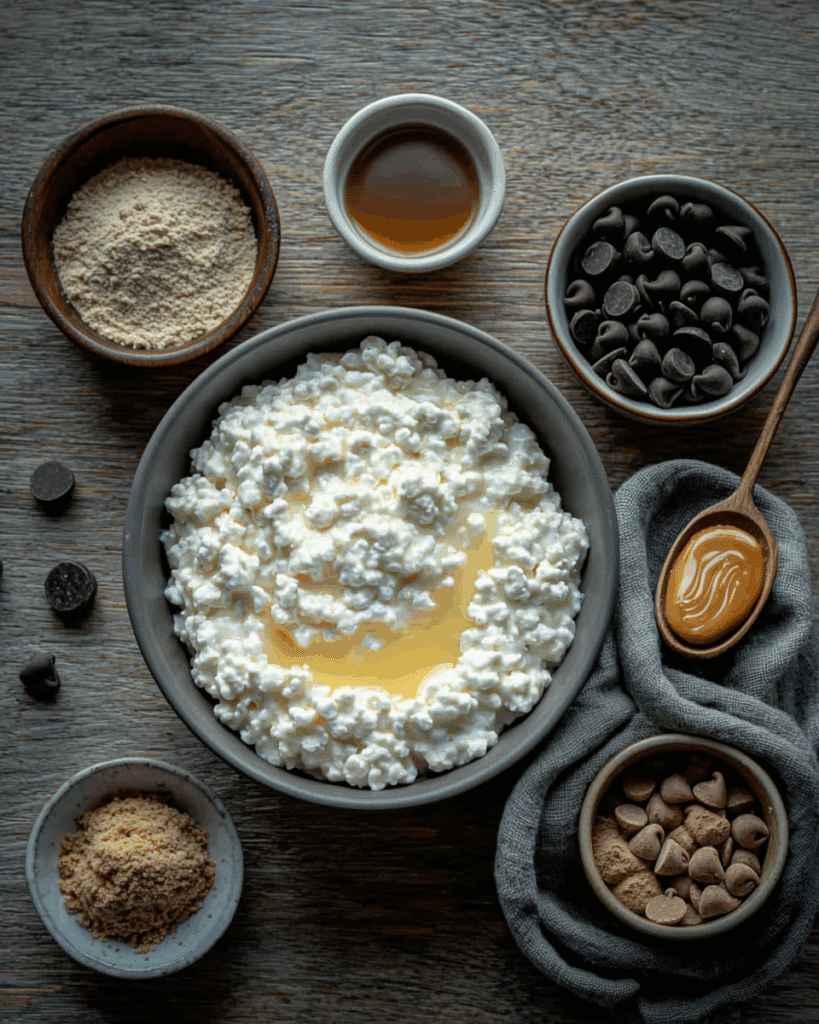Cottage cheese is the unexpected hero here—it blends into a silky texture and adds a boost of protein and creaminess. Maple syrup is your sweetener of choice, keeping the flavor warm and smooth. Vanilla extract enhances everything and gives that true cookie dough vibe. Almond flour adds body and keeps it grain-free. Vanilla protein powder amps up the nutrition while helping with structure. A spoonful of peanut butter deepens the flavor and makes it all feel extra decadent. Chocolate chips bring the nostalgia—and the joy.