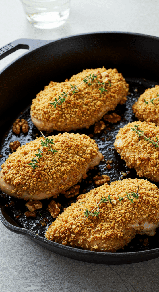 What makes Walnut-Crusted Chicken so special? This dish combines tender chicken (thighs or breasts) marinated in a zesty Dijon-wine mixture, coated in a crunchy walnut-flour crust, and baked to perfection in one oven-safe skillet. The honey mustard glaze adds a sweet-savory finish that elevates the flavors. Perfect for cozy evenings, dinner parties, or healthy meal prep, it’s naturally gluten-free adaptable, pairs beautifully with simple sides, and delivers a satisfying contrast of textures.