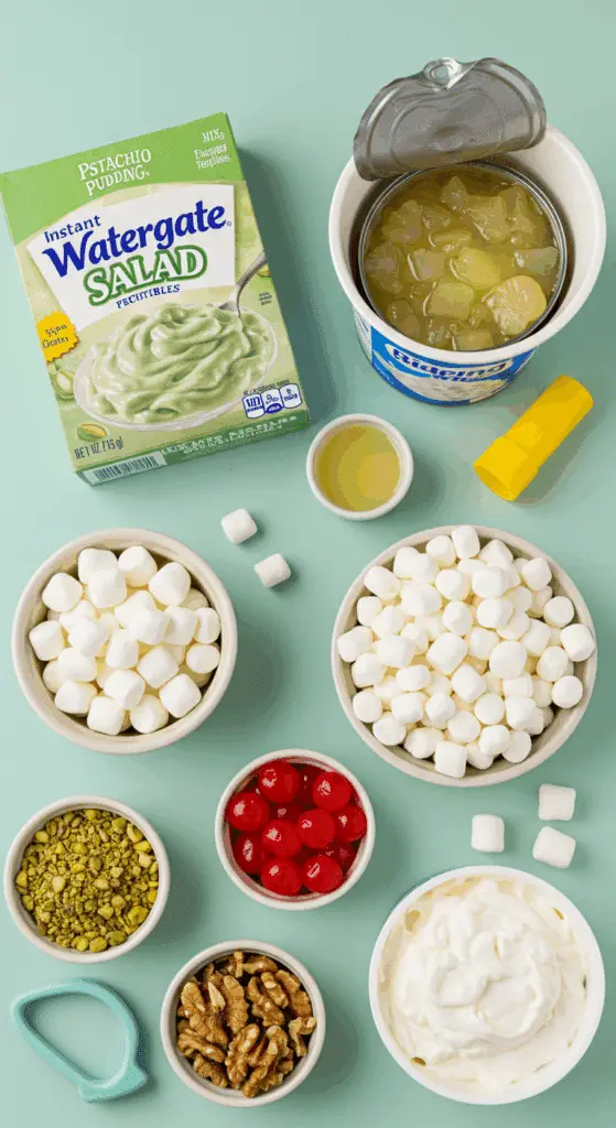 Watergate Salad uses just a handful of ingredients to create its signature creamy, fruity flavor. Here’s what you’ll need for 8 servings: