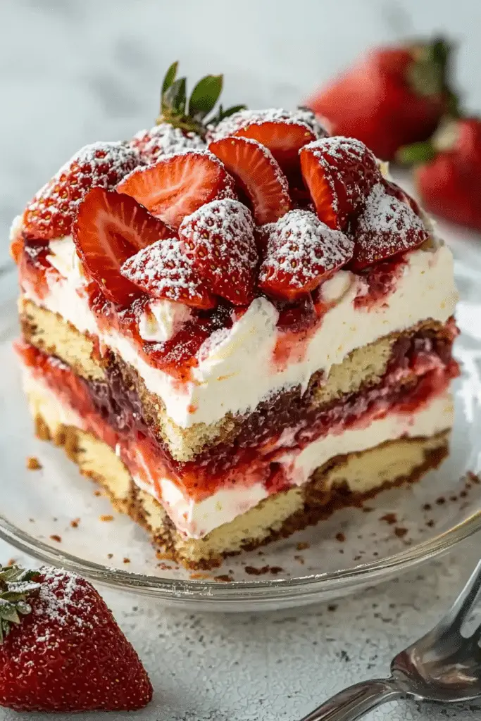 Summary: This no-bake dessert features layers of orange juice-dipped ladyfingers, a rich and creamy filling made with mascarpone cheese, cream cheese, and melted white chocolate, and fresh sliced strawberries. Chilled overnight, it sets into an elegant, sliceable dessert.
