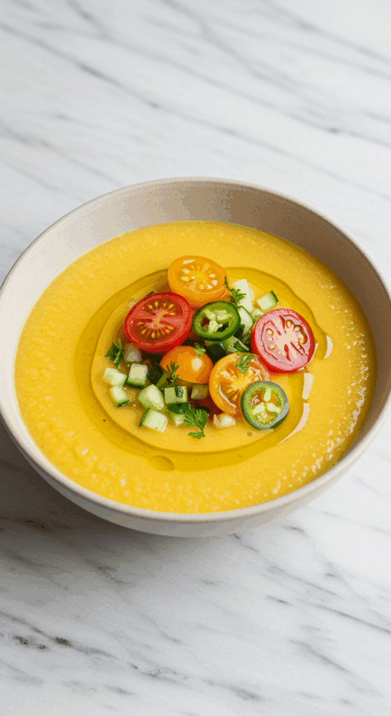 Making this Yellow Tomato Gazpacho is all about creating a refreshing, vibrant soup with colorful toppings. Here’s how to make it perfect: